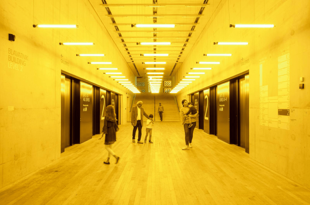 AT: I went into the exhibition not knowing which piece I was going to do. I had a look online at which ones would be there, I had rough ideas and kind of narrowed it down to about four. I think the reason Room For One Colour stood out for me so much is that it did take me by surprise. The majority of the exhibition is held within a White Cube exhibition space, as usual with Tate Modern. But this piece was just in the corridor outside the elevator entrances, and coming out of the elevators, it is a big surprise. You suddenly enter a mono-frequency space. When you step into it – which you have to do to get to the entrance of the exhibition – everything in your vision is within the yellow to black spectrum. You don’t necessarily realise it at first when you step into the space and then maybe you look at the person you’re with, and you’re like, Oh! It’s potentially very disconcerting at first, but it’s very playful as well. It was just very interesting to see people’s response to this space that they are thrust into without any prior warning. The exhibition had many other interesting installations, but I wanted to look at the curation of space. I thought that Room For One Colour would be most interesting to write about as the White Cube has been written about a lot. It would be more innovative and interesting to write about how an unusual space has been used.
