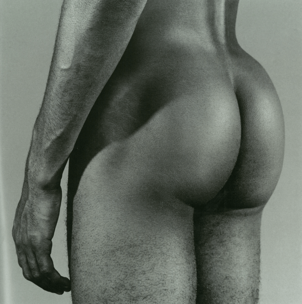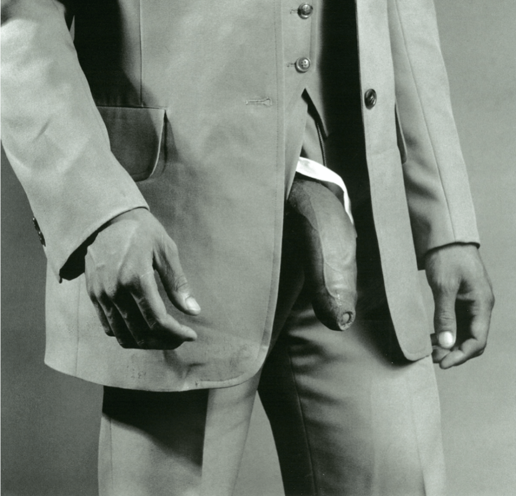 Many of the images have been criticised for fetishising the subjects and treating them solely as erotic objects. For example, images like Marty Gibson 1982, Untitled 1980, and Untitled 1981 are all anonymous fetishised depictions of male genitalia. The only aspect of the figure which is acknowledged is the genitals. Some of the images – such as Ajitto 1981 – are explicitly sexual and borderline pornographic. In this image, Ajitto is presenting himself to the camera, conducted by the white photographer. The key issue with these images of black male bodies by Mapplethorpe is that they push the stereotype of black men as hyper-sexual. Slatton has explained how ‘black men specifically [are] seen as child-like, animalistic, lazy, criminal, violent, and hyper-sexual’ (Slatton 2014). James Baldwin once described that ‘to be an American Negro male is also to be a kind of walking phallic symbol’ (Alsop et al, 2002). Mapplethorpe’s Black Book continues to perpetuate the idea of black men as purely sexual beings, and reduces them down to their genitalia. Man in Polyester Suit 1980 is potentially the most well-known image from the Black Book and, perhaps, the most problematic. As Mercer explains, ‘sex is [still] confirmed as the ‘nature’ of black men… his camouflage fails to conceal the fact that he originates essentially, like his dick, from somewhere anterior to civilisation’ (Yingling, 1990). Ultimately, Man in Polyester Suit ‘reduces its nameless model to a penis’, affirming the deeply problematic and dangerous stereotype of black men as hyper-sexual (Asen, 1998).