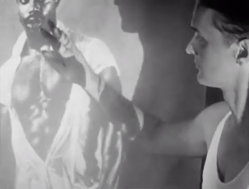 Looking for Langston discusses the dominance of white men in queer spaces, with specific reference to Mapplethorpe’s Black Book. In one scene, a white man walks though and admires projections of photographs of black men from Black Book. This section ends with the white man handing money over to a black man after they’ve had sex. The voice over for this section features a man talking to this white man about the black man – he says ‘‘you’re always busy, seeking other things of him, his name isn’t important, it would be coincidence if he had a name, a face, a mind… to you he’s only visible in the dark”. This is a deliberate criticism of Mapplethorpe’s images and the wider issues to which they are linked. Julien shows a white man admiring these photographs, demonstrating that they are created for the pleasure of the white queer male gaze. The voiceover explaining that there is no care for a name or face is reflective of how many of Mapplethorpe’s images of black men do not feature the models face, only their genitals. In an article written by Julien and Mercer, they write that ‘according to Mapplethorpe’s line of sight: Black + Male = Aesthetic Erotic Object’ (Mercer and Julien, 1996). Julien is specifically highlighting this notion and criticising it in this scene. He affirms this objectifying gaze as applicable to many white queer men, and highlights the complex racial power relations at play within the gay community.